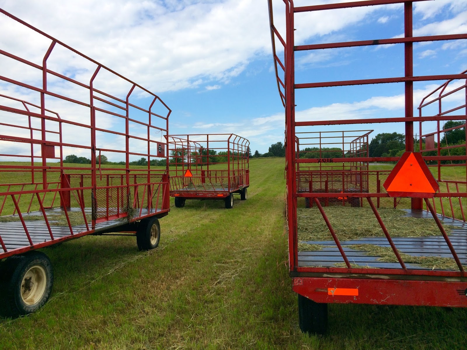 "Beauty" shot of four wagons, at their rest, plenty of work ahead of them later this summer. What I had seen was first hay harvest only.